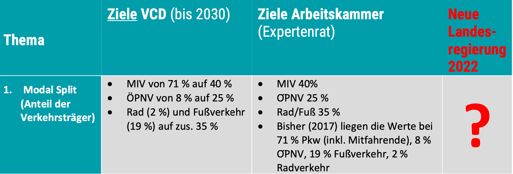 Die Webseiten der Landesregierung lassen diesbezüglich keine klaren Aussagen erkennen. Demgegenüber hatte die Arbeitskammer mit ihrem verkehrspolitischen Expert*innenrat und auch der VCD in seiner Resolution vom April einen Katalog mit zehn Zielen veröffentlicht, die eine ähnliche Ausrichtung für die Verkehrswende aufzeigen. Wie stellt sich die Landesregierung dazu? Welche Ziele setzt sich die neue Landesregierung bei den Themen Verkehr und Mobilität?