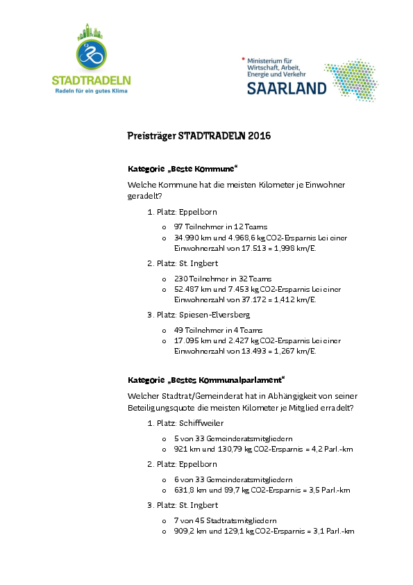Mit einer saarlandweiten Abschlussveranstaltung ist am Dienstag, 25. Oktober, die Premiere der Kampagne STADTRADELN im Saarland zu Ende gegangen. Seit dem Startschuss am 24. Mai waren die saarländischen Teilnehmerkommunen jeweils in ihrem individuellen Kampagnenzeitraum an 21 aufeinanderfolgenden Tagen um die Wette geradelt. Bei der Festveranstaltung im Saarbrücker Schloss wurde nun offiziell Bilanz gezogen: 17 saarländische Kommunen nahmen am STADTRADELN teil. Insgesamt gingen über 1.400 Radfahrerinnen und Radfahrer in 161 Teams an den Start und brachten es auf mehr als 322.000 Radkilometer. Das entspricht der achtfachen Länge des Äquators. Mit den zurückgelegten Radkilometern haben die Teilnehmerinnen und Teilnehmer mehr als 45.800 kg CO2 eingespart. Die Schirmherrin, Verkehrsministerin Anke Rehlinger, sieht die positive Bilanz als Bestätigung für die Kampagne. „Die Zahlen zeigen uns, dass die saarländischen Bürgerinnen und Bürger etwas bewegen wollen. Mit ihrer Teilnahme an der Kampagne haben sie nicht nur einen tollen Beitrag zum Klimaschutz und zu einer besseren Lebensqualität in unseren Städten und Gemeinden geleistet. Sie haben auch dafür gesorgt, dass das Thema Alltagsradverkehr in der Öffentlichkeit wahrgenommen wird. Das wird uns helfen, den Ausbau des Alltagsradverkehrs im Saarland weiter voranzubringen. Ich bedanke mich daher ganz herzlich für das Engagement der Teilnehmerinnen und Teilnehmer.“ Bei der Abschlussveranstaltung trafen nun die Teilnehmerinnen und Teilnehmer der Kampagne aufeinander und hatten die Gelegenheit, Fotos und Ergebnisse aus 21 Tagen STADTRADELN zu präsentieren und ihre Erlebnisse und Erfahrungen auszutauschen. Unter allen Stadtradeln-Teilnehmern wurden Sachpreise rund ums Rad verlost. Höhepunkt der Abschlussveranstaltung war die Prämierung der fahrradaktivsten Kommunen, Kommunalparlamente und Teams. Der Preis für die beste Kommune ging dabei an die Gemeinde Eppelborn. Gemessen an der Einwohnerzahl hat Eppelborn die meisten Radkilometer pro Kopf zurückgelegt: In 12 Teams erradelten die 97 Radfahrerinnen und Radfahrer 34.990 Kilometer und sparten fast 5.000 kg CO2 ein. Der Preis für das größte Team ging an die Schillerschule nach Neunkirchen: 46 Radlerinnen und Radler traten gemeinsam bei STADTRADELN an. Besonderes erfolgreich war der STADTRADLER-Star, den Eppelborn ins Rennen schickte: Mit 1.177 Kilometern radelte Sabine Busch sogar bundesweit auf den zweiten Platz unter den STADTRADLER-Stars. Oberbürgermeisterin Charlotte Britz und Regionalverbandsdirektor Peter Gillo verliehen die Auszeichnungen an die Teilnehmerinnen und Teilnehmer. Beide lobten das Engagement der Radfahrerinnen und Radfahrer. „Ich freue mich, dass so viele Bürgerinnen und Bürger in Saarbrücken an der Aktion STADTRADELN teilgenommen haben. Unsere 32 Teams sind trotz schlechten Wetters gemeinsam auf insgesamt 64.467 Kilometer gekommen. Das Engagement unserer Bürgerinnen und Bürger zeigt, dass sie das Fahrrad als gute Alternative zum Auto wahrnehmen und auch nutzen. Mit unserem neuen Verkehrsentwicklungsplan haben wir es uns zum Ziel gesetzt, die Radinfrastruktur in Saarbrücken konsequent weiter auszubauen,“ so die Oberbürgermeisterin. Regionalverbandsdirektor Peter Gillo sagte: „Es ist unverkennbar, dass auch im Regionalverband der Trend zum Fahrrad als Alltagsverkehrsmittel immer weiter voranschreitet. Mit 382 Radlerinnen und Radlern kamen die meisten Teilnehmer am Stadtradeln aus dem Regionalverband. 2017 werden wir verstärkt in den Umland-Kommunen Saarbrückens um Teilnehmer werben. Denn mit dem velo visavis-Wegenetz haben wir rund 270 Kilometer Fahrradwege, die alle Gemeinden des Regionalverbandes mit unseren französischen Nachbarregionen über verkehrsberuhigte und landschaftlich reizvolle Wege verbinden.“ Wirtschaftsministerin Anke Rehlinger sicherte bereits zu, dass das Saarland sich auch 2017 an der Kampagne beteiligen werde. Wie auch in diesem Jahr übernehme das Wirtschaftsministerium die Teilnahmegebühren für die Kommunen.