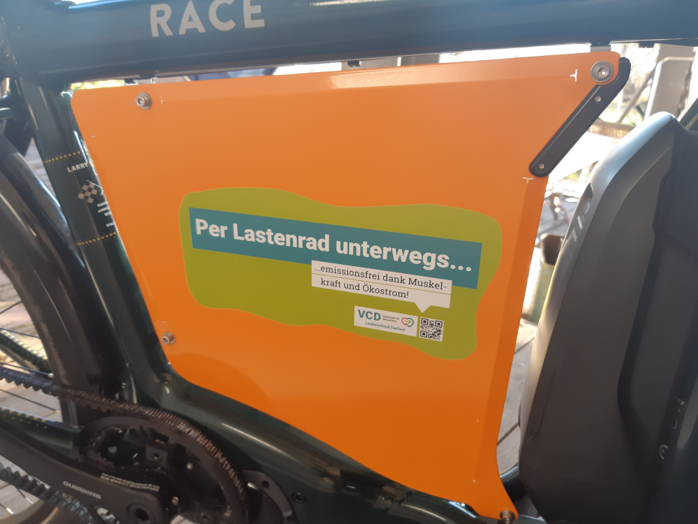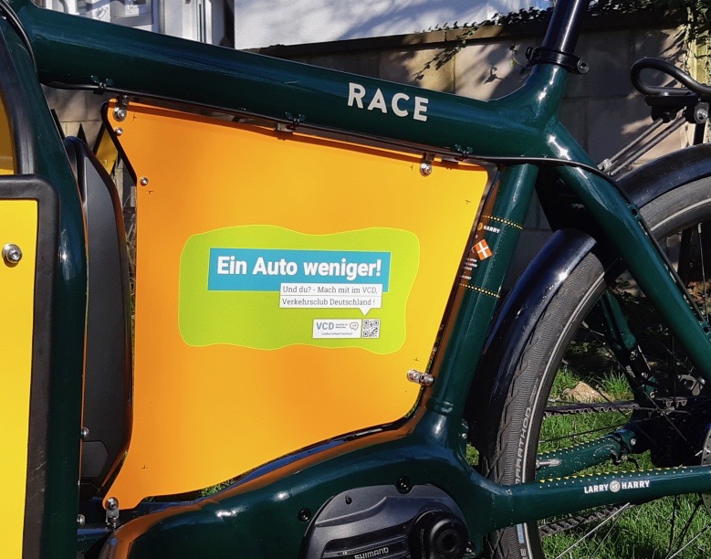 Zusätzlich dazu hält der VCD Saar ein weiteres Goody bereit für alte und neue Lastenradler*Innen: Wer sein Cargo-Velo beidseitig mit den Aufklebern des VCD-Saarland beklebt, erhält eine einährige, kostenfreie Testmitgliedschaft und natürlich die schmucken Aufkleber. Und für alle, die schon MItglied sind, gibt es als Aufwandsentschädigung ein wertiges Präsent. – Kontakt&Bewerbung gleich an service@vcd-saar.org .