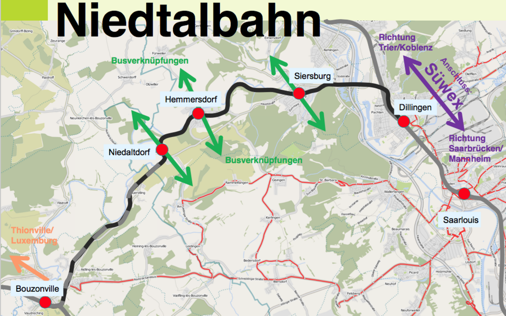 Diese Bahnlinie entlang des Flüsschens Nied ist die einzige intakte Eisenbahnstrecke zwischen Deutschland und Frankreich ohne regelmäßigen Zugverkehr. Nach Schließungen in der Stahlindustrie in Nordostlothringen waren die schweren Güterzüge mit flüssigem Roheisen entfallen. Im Personenverkehr spielte die Strecke aufgrund der sehr geringen Siedlungsdichte zwischen Saar und Mosel bisher keine Rolle.