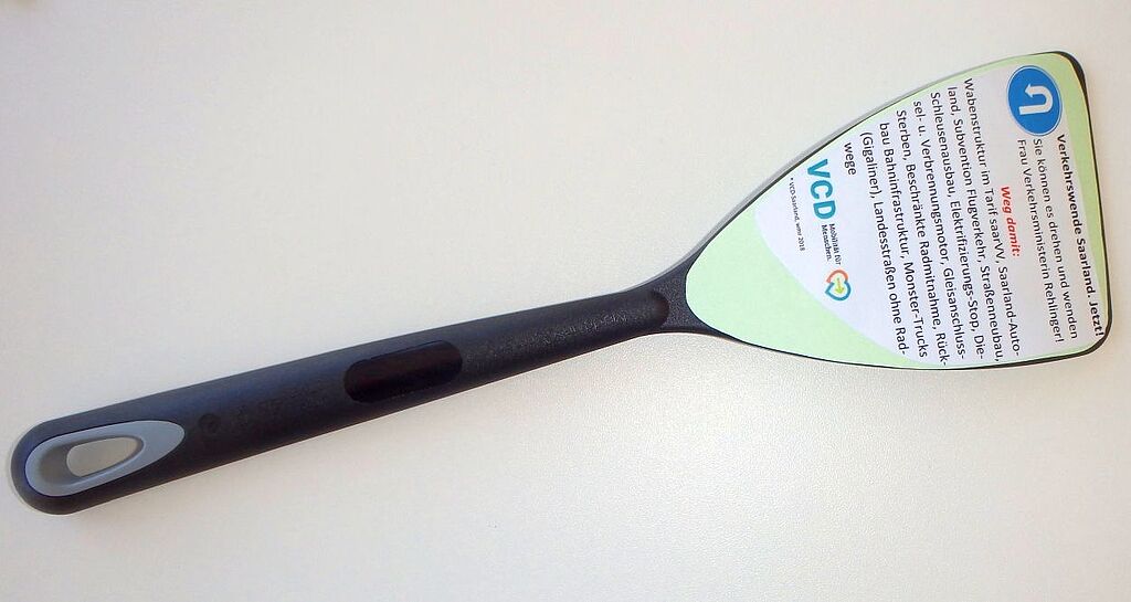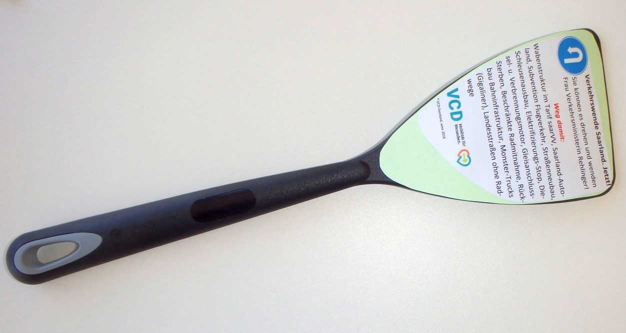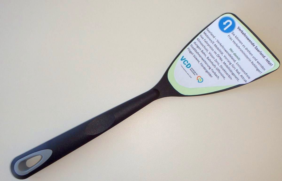 Ein besonderes Präsent hatte Andrea Schrickel für die Ministerin noch zusätzlich: Den Verkehrswende aus dem Küchenstudio von VCD-Vize Werner Ried. Das Utensil resümiert anschaulich den Handlungsbedarf in der saarländischen Verkehrspolitik.