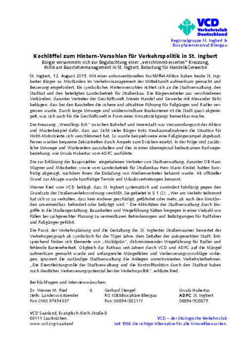 Um die bisher noch vorgesehenen Abbiegespuren in der Kohlenstraße zu ersetzen, empfiehlt Werner Ried einen Blick in den Nachbarort Altenwald: „Dort gibt es mehrere Mini- Verkehrskreisel, die von größeren Fahrzeugen mittig überfahren werden können. Solche Kreisel könnten in der Kohlenstraße und auch der Schlachthofstraße die zahlreichen Ampelanlagen ersetzen. Dies würde den Verkehr entschleunigen, weil jeder die Vorfahrt achten muss, zugleich würde es das Fortkommen beschleunigen, weil man nicht mehr lange vor den Ampeln warten muss“, nennt Ursula Hubertus als weiteren Vorteil des gemeinsamen Konzepts des ADFC und Verkehrsclub Deutschland (VCD). Von 10 bis 13 Uhr gab es in der Kohlenstraße Livemusik, einen Kindermalwettbewerb und spezielle Radler-Döner…