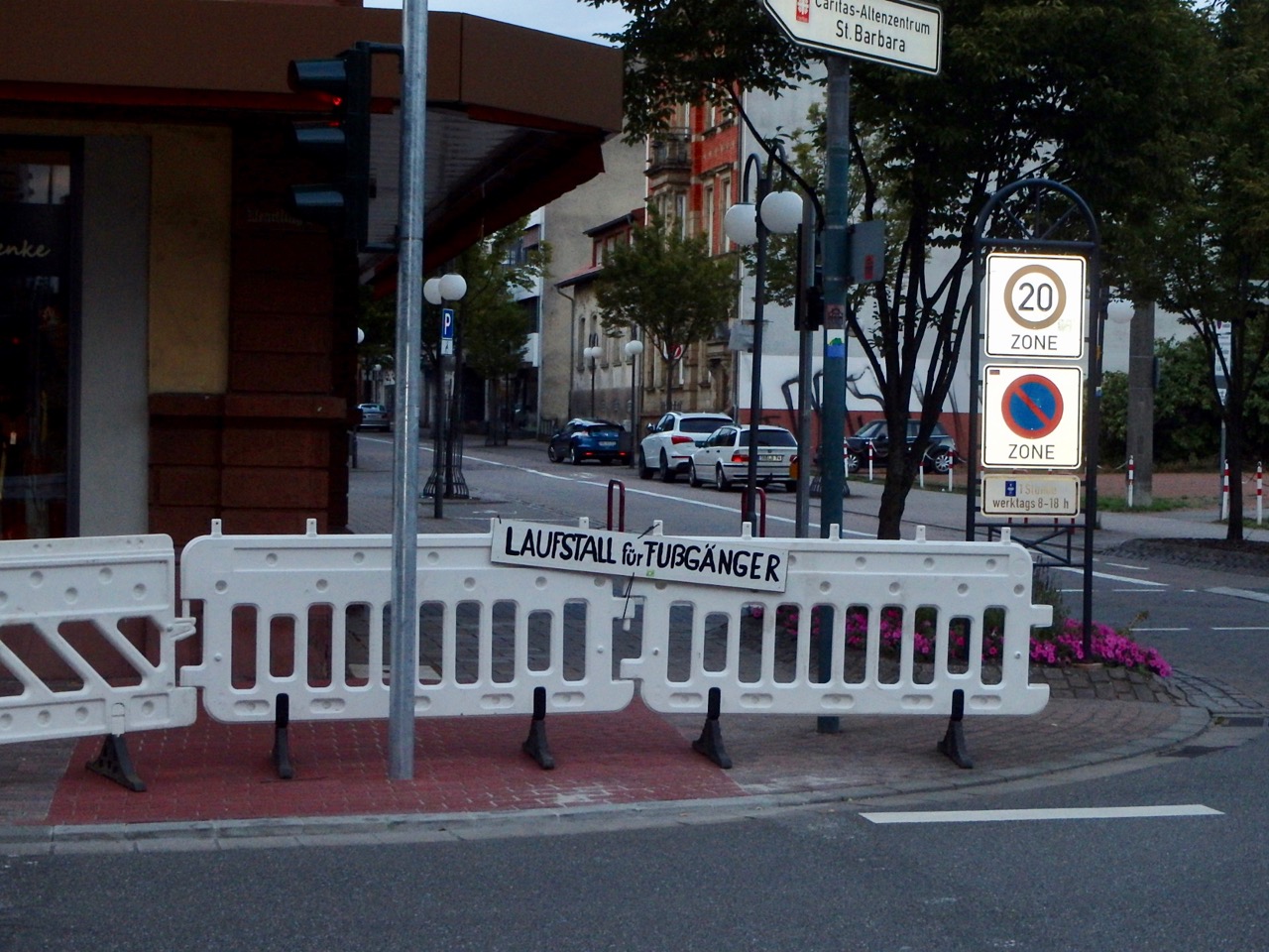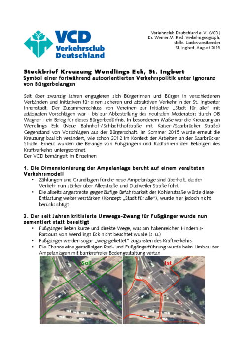 Die Kreuzung Wendlings Eck mit anschließender Schlachthofstraße, Kaiserstraße in die Innenstadt und Hauptwege zum Bahnhof bzw. ins Scheidter Tal zeigt beispielhaft, wie einseitig die Verkehrsgestaltung zugunsten des Autoverkehrs ausfallen kann. Flüssigkeit des Verkehrs spielt für die Verantwortlichen nur beim Kraftverkehr eine Rolle. An dieser Kreuzung müssen Fußgänger Umwege beschreiten, an Bettelampeln lange auf grün warten und sich im Wirrwarr der Wegeführug erst einmal orientieren. Besonders pikant: Die Hauptverbindung zwischen Kaiserstraße und Saarbrücker Straße hatte die Stadtverwaltung unter OB Wagner in einem Musterbeispiel der Unverfrorenheit für Fußgänger kurzerhand gekappt; – zusätzliche Umwege und Zeitaufwand sind seither zu ertragen.