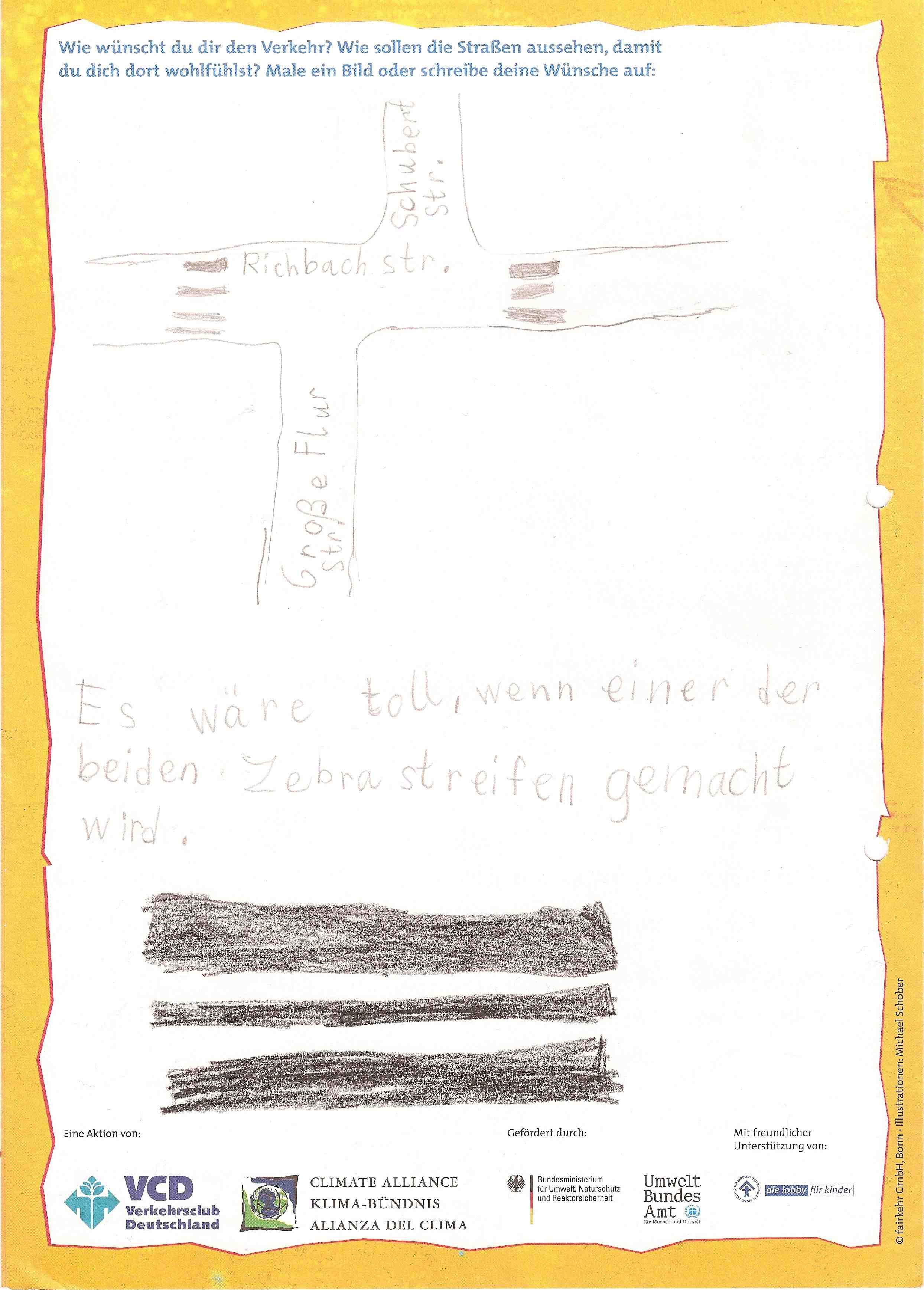 Größter Erfolg für den VCD in St. Ingbert war der Zebrastreifen auf der Rischbachstraße in Höhe der Haupt-Fußweg-Achse Große Flurstraße/Schubertstraße (siehe Foto oben). Er geht zurück auf das Ergebnis unserer Umfrage unter den Schulkindern. Sie haben gemalt, wo es unterwegs unangenehm ist und was besser sein könnte.